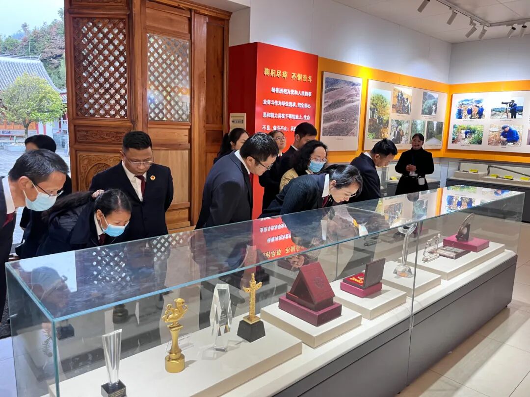 行至大亮山脊,全体党员在杨善洲生前居住的窝棚前久久驻足,在不足8平米的夯土墙内,煤油灯、蓑衣斗笠、石头火塘、单薄被褥都在无声诉说着“草鞋书记”的清廉本色。在这漏雨的窝棚里一住就是9年,年迈老书记艰苦奋斗的工作作风,让干警们红了眼眶。跟随讲解员脚步,干警们走进杨善洲事迹陈列馆。一张张泛黄照片、一件件农具实物、一段段垦荒影像,生动再现了老书记22年扎根大亮山、将荒山变绿洲的感人事迹。