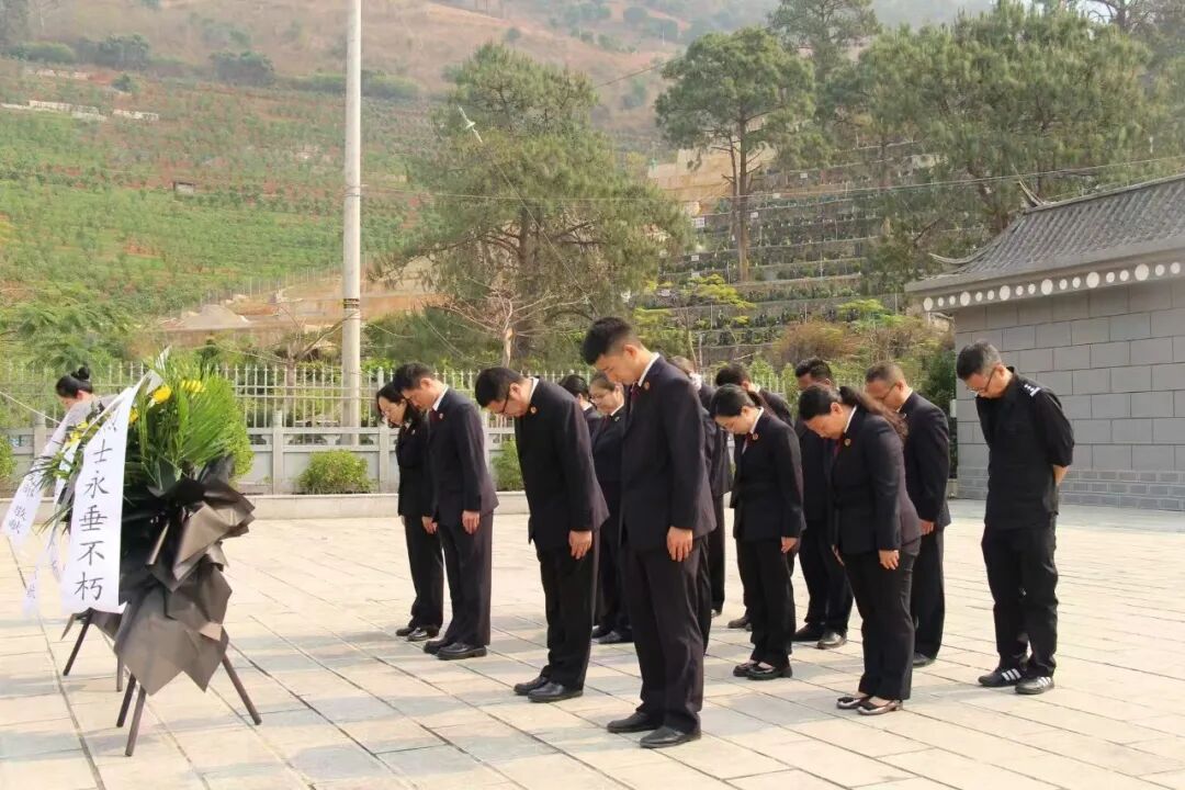 在庄严肃穆的革命烈士纪念碑前,干警们整齐列队,向英烈敬献花篮。金黄的菊花在阳光下低垂,寄托着对先烈的无限追思。全体干警鞠躬、垂首默哀,深切悼念为民族独立、人民解放和国家富强英勇献身的革命先烈。