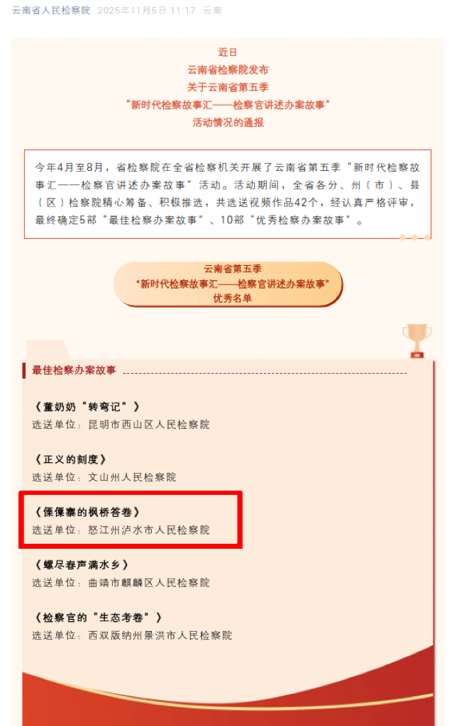 省级最佳!泸水市人民检察院作品《傈僳寨的枫桥答卷》荣获全省“最佳检察办案故事