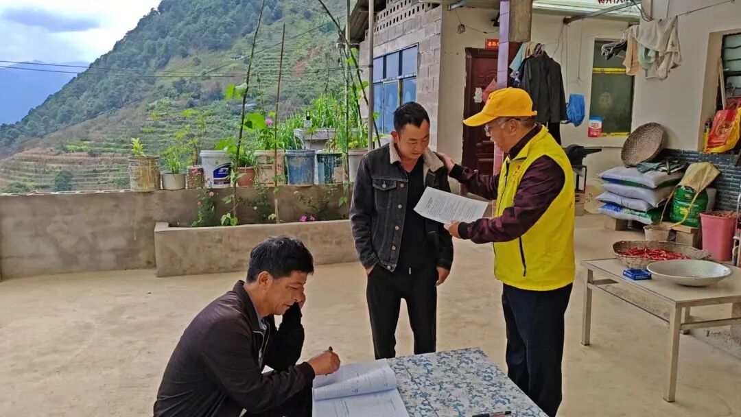 如今的密应华,鬓角已染风霜,腰间贴着膏药,却依然保持着满分的工作热情开展驻村工作。三次爆胎、两次险坠山崖、数度与滚石擦肩而过的驻村经历,未能动摇这位老党员的信念。