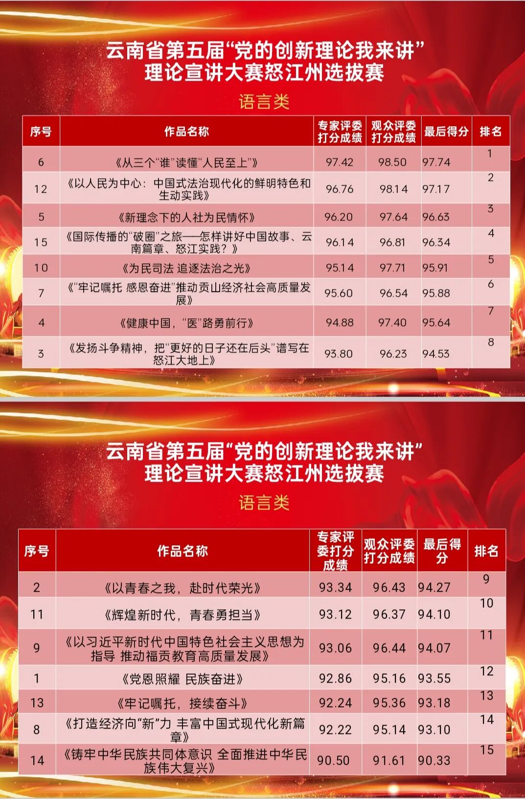 我院干警杨希誉《以人民为中心:中国式现代化的鲜明特色和生动实践》荣获语言类二等奖。我院干警胡舰心《为民司法 追逐法治之光》荣获语言类三等奖。7月3日,中共怒江州委宣传部组织开展了以“沿着习近平总书记指引的方向阔步前行 奋力谱写中国式现代化云南篇章”为主题的党的创新理论我来讲怒江州选拔赛在州融媒体中心举行。此次活动共选取21个宣讲作品进入决赛,其中语言类15个,文艺类节目6个。